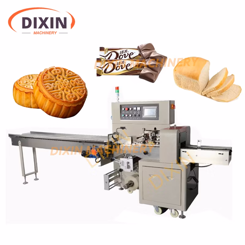 DIXIN Horizontal flow packing machine & pillow packaging machine is suitable for different kinds of product packing into roll film bags. Such as candy, chocolate, protein bars, bakery food of cake, biscuit, bread, instant noodle, leafy vegetables, fruit and non-food products like hardware parts, daily supplies, hotel supplies, medical products, ect.